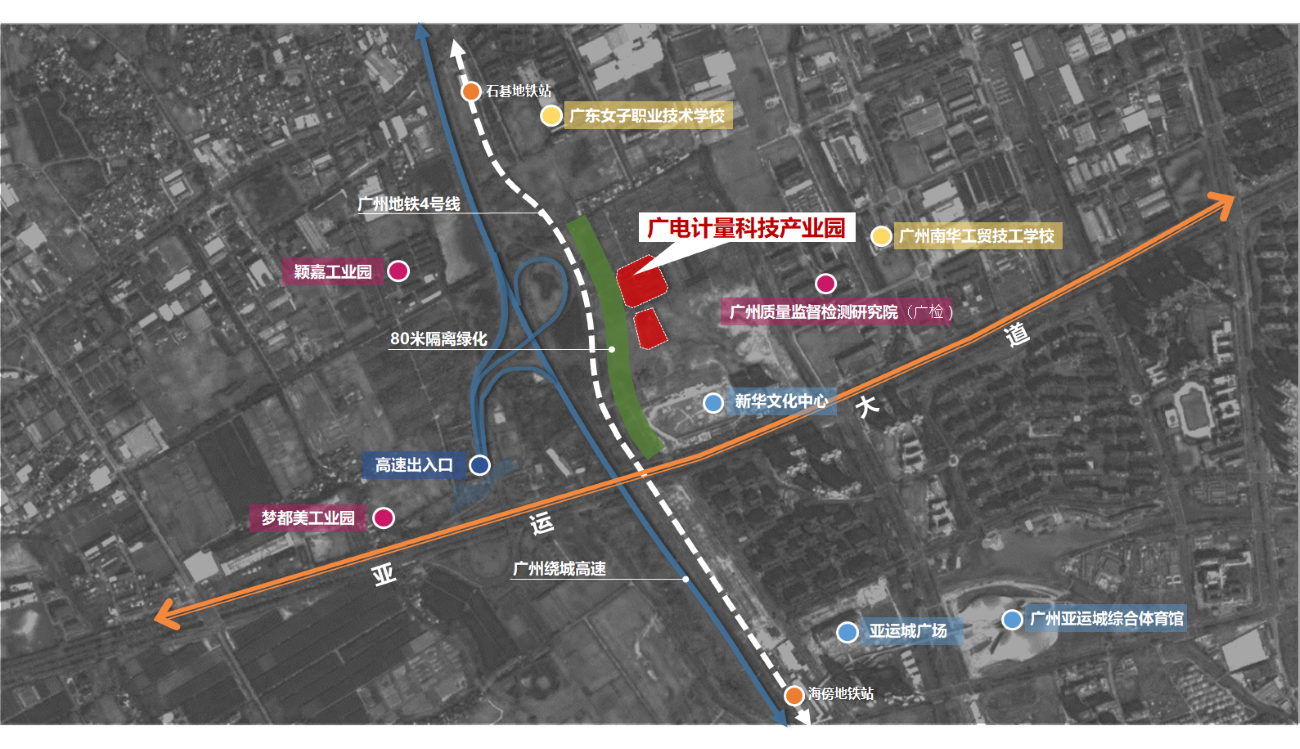 廣電計(jì)量科技產(chǎn)業(yè)園是由廣電計(jì)量檢測集團(tuán)股份有限公司投資興建的全球總部基地,位于廣州市番禺區(qū)專精特新企業(yè)集聚區(qū),已入駐多家高新技術(shù)企業(yè);毗鄰新華里文化綜合體,南側(cè)為亞運(yùn)城小區(qū),周邊生活配套完善;處于亞運(yùn)大道北側(cè),西臨廣州繞城高速,靠近廣州南站及蓮花山港等海陸交通樞紐,交通十分便捷。