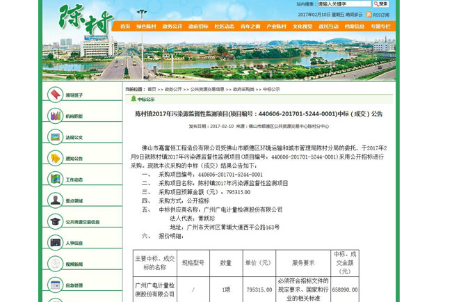 2月10日,廣電計(jì)量憑借商務(wù)技術(shù)得分的明顯優(yōu)勢,以總分第一的成績成功中標(biāo)佛山市順德區(qū)陳村鎮(zhèn)2017年污染源監(jiān)督性監(jiān)測項(xiàng)目,這也是廣電計(jì)量2017年在環(huán)境檢測領(lǐng)域的新春第一標(biāo)。中標(biāo)合同順利簽訂后,廣電計(jì)量將為順德區(qū)陳村鎮(zhèn)的污染源監(jiān)督性監(jiān)測提供科學(xué)公正的數(shù)據(jù)和專業(yè)的技術(shù)服務(wù)保障。