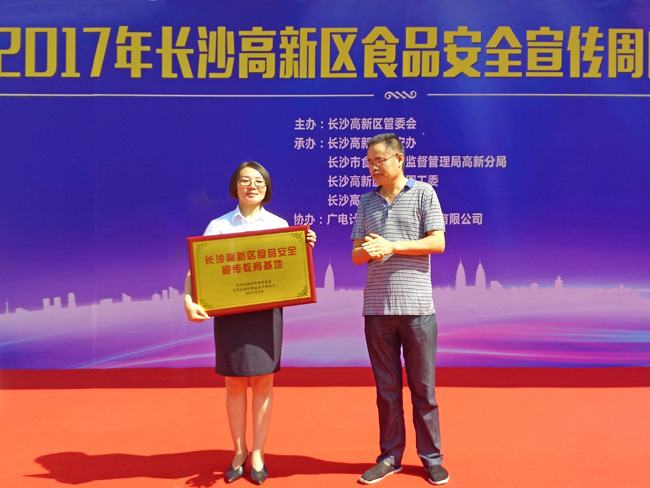 7月6日,2017年長(zhǎng)沙高新區(qū)食品安全宣傳周暨長(zhǎng)沙高新區(qū)食品安全宣傳教育基地授牌儀式,在高新區(qū)廣電計(jì)量大廈廣場(chǎng)前隆重舉行,來(lái)自長(zhǎng)沙高新區(qū)管委會(huì)、長(zhǎng)沙市食藥監(jiān)局、長(zhǎng)沙高新區(qū)食安辦、長(zhǎng)沙市食藥監(jiān)局高新分局、長(zhǎng)沙高新區(qū)共青團(tuán)工委、麓谷街道等相關(guān)政府領(lǐng)導(dǎo),攜食品行業(yè)代表及食品安全志愿者、周邊街道群眾逾300人,共同見(jiàn)證長(zhǎng)沙高新區(qū)食品安全宣傳教育基地落戶廣電計(jì)量。