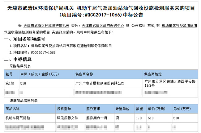 天津市武清區環境保護局機關 機動車尾氣及加油站油氣回收設施檢測服務采購項目 (項目編號:WQCG2017-1066)中標公告
