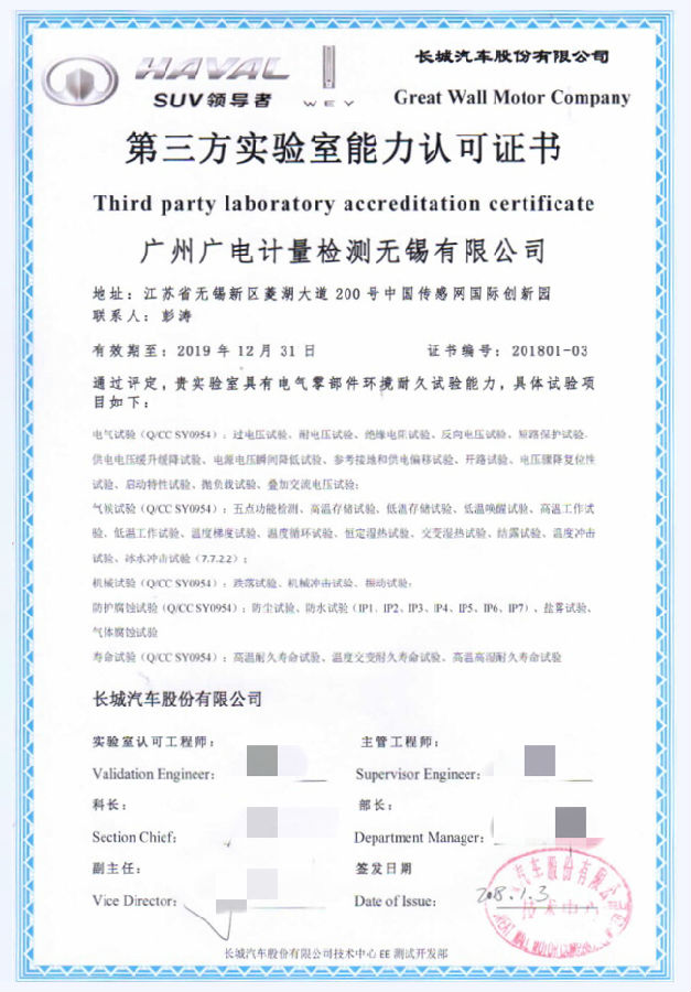 無(wú)錫子公司獲得長(zhǎng)城汽車(chē)電氣零部件環(huán)境耐久試驗(yàn)授權(quán)認(rèn)可