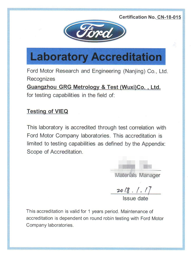 無(wú)錫子公司獲得福特汽車(chē)第三方實(shí)驗(yàn)室VOC認(rèn)可