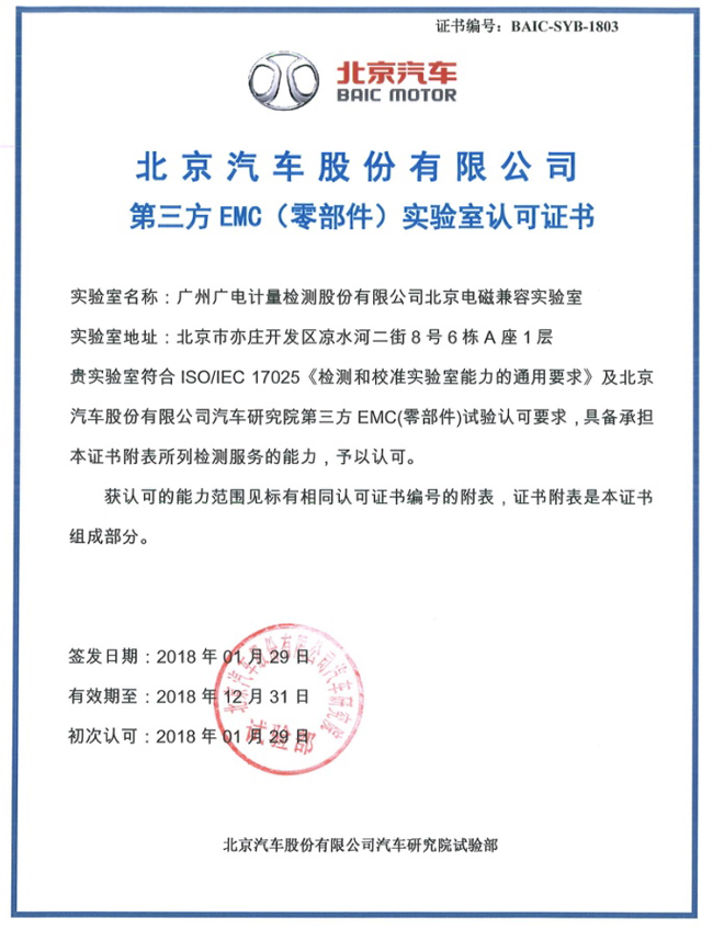 北京檢測(cè)基地電磁兼容實(shí)驗(yàn)室獲得北京汽車(chē)第三方EMC(零部件)實(shí)驗(yàn)室認(rèn)可