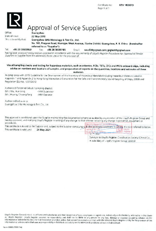 5月22日,廣電計量通過一系列嚴格審核,順利獲得英國勞氏船級社授予的船舶有害物質(zhì)取樣及實驗室檢測機構(gòu)認可證書。這是繼獲得中國船級社(CCS)及美國船級社(ABS)船舶有害物質(zhì)檢測機構(gòu)認可之后,廣電計量再度獲得國際權(quán)威船級社認可。
