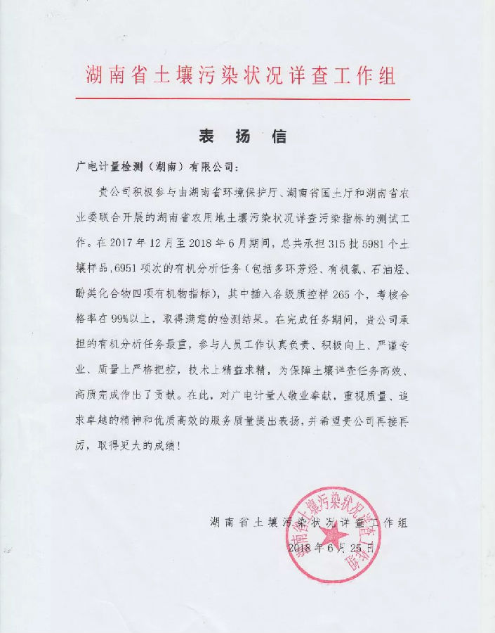 湖南省土壤污染狀況詳查工作組表?yè)P(yáng)信