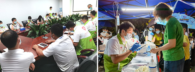 5月31日,為響應廣州市天河區大規模核酸檢測工作社區志愿服務的需求,廣電計量2小時內火速集結17名青年黨員、團員志愿者,組成青年抗疫突擊隊緊急支援天河區南富社區核酸檢測大排查工作。志愿者們當晚冒著大雨,在現場引導社區居民手機掃碼填寫登記受檢人信息,協助維持排隊秩序和分流人群,用實際行動為社區居民和醫護人員辦實事。
