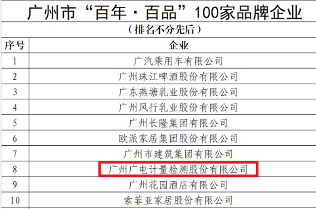 7月6日,廣州市質(zhì)量強(qiáng)市工作領(lǐng)導(dǎo)小組辦公室發(fā)布廣州市“百年·百品”企業(yè)名單,廣電計(jì)量憑借出色的綜合實(shí)力和良好的企業(yè)責(zé)任擔(dān)當(dāng),在近400家廣州本土品牌企業(yè)的角逐中脫穎而出,成功入選百強(qiáng)企業(yè)名單。