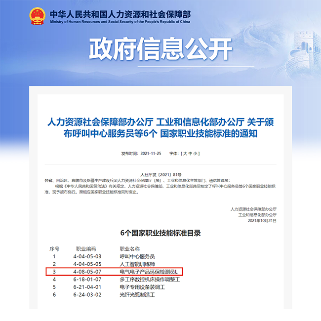 2020年2月25日,人社部、國(guó)家統(tǒng)計(jì)局、市場(chǎng)監(jiān)督管理總局聯(lián)合向社會(huì)發(fā)布了16個(gè)新職業(yè)。其中,“電氣電子產(chǎn)品環(huán)保檢測(cè)員”作為“綠色職業(yè)”被正式納入國(guó)家職業(yè)分類(lèi)目錄。這是自2019年國(guó)家新職業(yè)發(fā)布以來(lái)的第二批國(guó)家新職業(yè),其中“電氣電子產(chǎn)品環(huán)保檢測(cè)員L”名列其中,是環(huán)保類(lèi)的唯一新職業(yè),也是工信部送審的5個(gè)新職業(yè)中唯一被專(zhuān)家評(píng)審?fù)ㄟ^(guò)的新職業(yè),是對(duì)電氣電子產(chǎn)品環(huán)保從業(yè)人員的認(rèn)可。