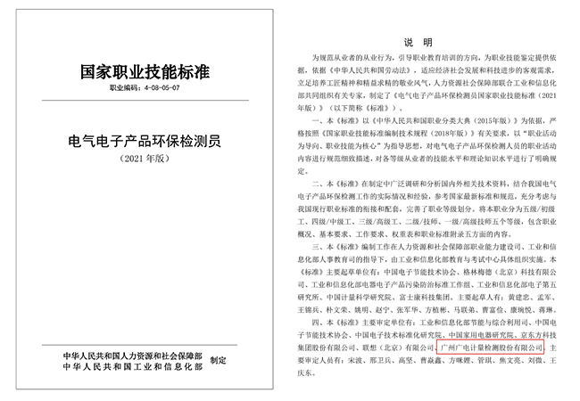 11月25日,由人力資源社會(huì)保障部、工業(yè)和信息化部共同制定的國(guó)家職業(yè)技能標(biāo)準(zhǔn)《電氣電子產(chǎn)品環(huán)保檢測(cè)員國(guó)家職業(yè)技能標(biāo)準(zhǔn)(2021年版)》(以下簡(jiǎn)稱(chēng)《標(biāo)準(zhǔn)》)正式發(fā)布。作為《標(biāo)準(zhǔn)》主要審定單位之一,廣電計(jì)量參與了該新職業(yè)技能標(biāo)準(zhǔn)的審定工作,積極服務(wù)新職業(yè)人才建設(shè),助力綠色制造轉(zhuǎn)型升級(jí)。