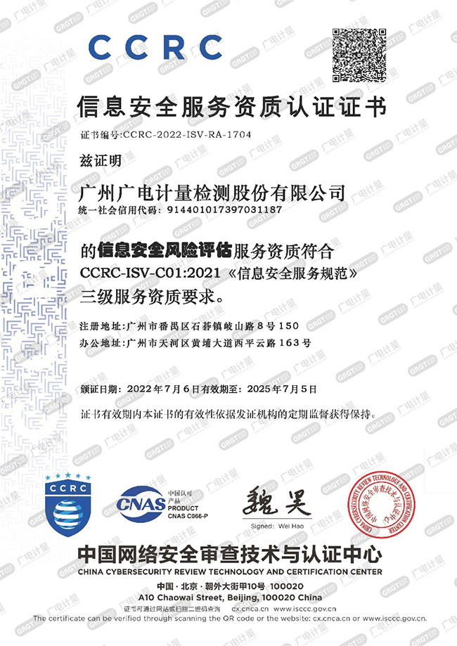 ? ? ? ? 7月6日,廣州廣電計(jì)量檢測(cè)股份有限公司(簡(jiǎn)稱“廣電計(jì)量”,002967.SZ)經(jīng)過(guò)嚴(yán)格審查,獲得中國(guó)網(wǎng)絡(luò)安全審查技術(shù)與認(rèn)證中心(CCRC)頒發(fā)的信息安全服務(wù)資質(zhì)認(rèn)證證書(shū),成為信息安全風(fēng)險(xiǎn)評(píng)估服務(wù)機(jī)構(gòu),實(shí)現(xiàn)了公司在信息安全服務(wù)領(lǐng)域的重要突破。