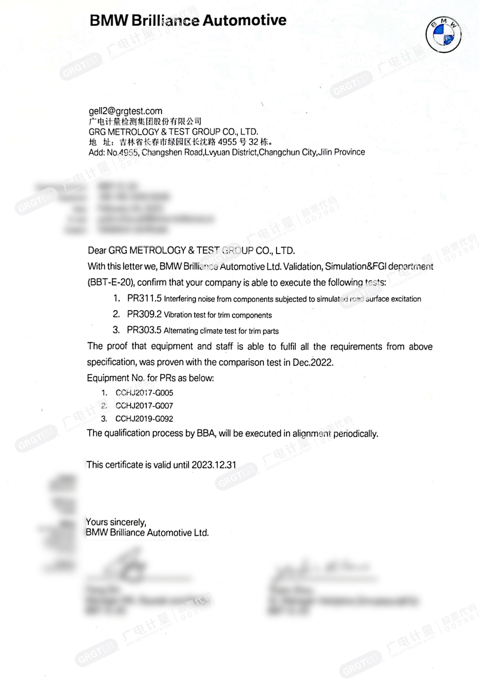 近日,廣電計量檢測集團股份有限公司(簡稱“廣電計量”,002967.SZ)經過嚴格審查,獲得華晨寶馬2023年的異響及環境可靠性測試與評估資質認可,成為國內極少數可以執行帶環境倉異響測評的第三方檢測機構之一。