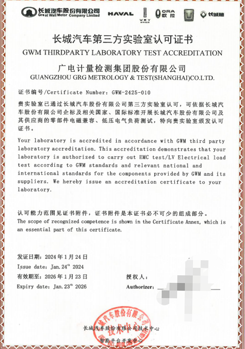 近日,廣州廣電計量檢測(上海)有限公司電磁兼容檢測實驗室成功獲得福特汽車FMC1278 Rev 4全項目檢測試驗全球授權認可、長城汽車EMC和電氣性能檢測試驗授權認可,后續將為汽車企業嚴格質量管控、提升產品質量、打造核心競爭力提供有力技術支持,表明了合作伙伴對廣電計量技術能力、硬件配置、人才團隊、質量管控等全方位綜合實力的肯定。