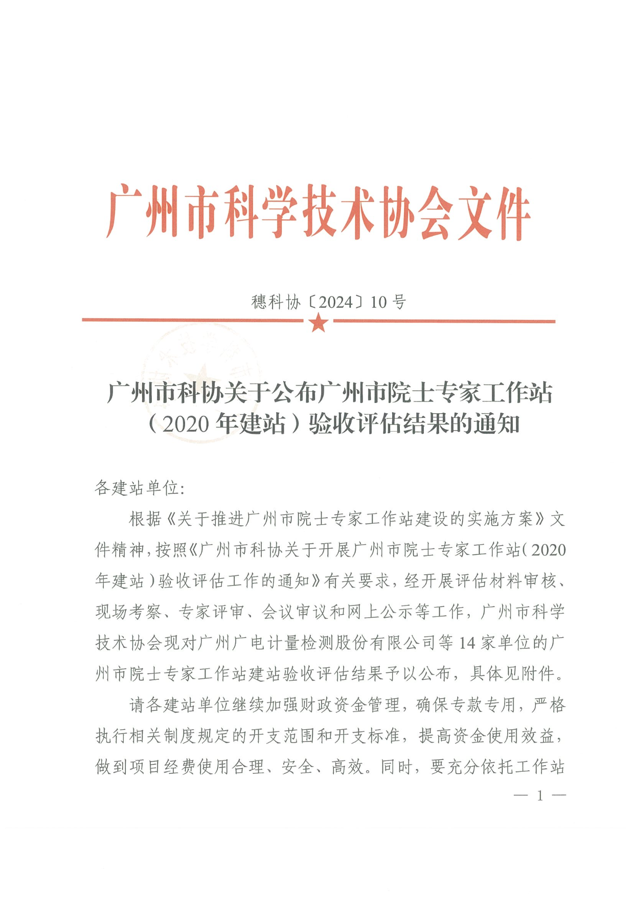 近日,廣州市科學技術協會發布了“關于公布廣州市院士專家工作站( 2020年建站)驗收評估結果的通知”,其中廣電計量以“優秀”評級順利通過驗收評估。