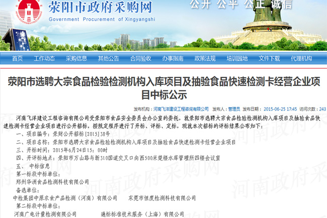 6月24日,廣電計(jì)量河南子公司成功中標(biāo) “滎陽(yáng)市選聘大宗食品檢驗(yàn)檢測(cè)機(jī)構(gòu)入庫(kù)項(xiàng)目及抽驗(yàn)食品快速檢測(cè)卡經(jīng)營(yíng)企業(yè)項(xiàng)目”第二標(biāo)段,項(xiàng)目執(zhí)行時(shí)間為2015年6月至2016年底,內(nèi)容包括食品、農(nóng)產(chǎn)品抽樣及檢測(cè)一條龍服務(wù),中標(biāo)金額500萬(wàn)元。