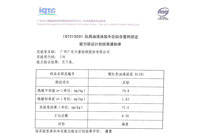 GRGT近期收到廣東出入境檢驗檢疫局檢驗檢疫技術中心關于“IQTC15C01 玩具油漆涂層中總鉛含量的測定”能力驗證計劃結果通知單,結果顯示GRGT化學分析測試中心檢測結果的Z比分數為0.30,成績突出,順利通過本次能力驗證。