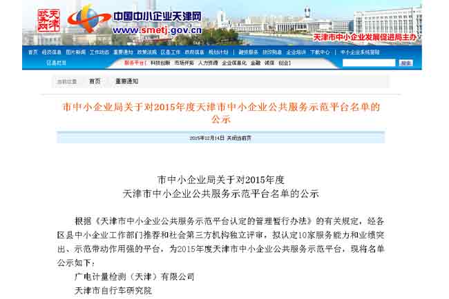 近日,由天津市中小企業發展促進局開展的2015年度天津市中小企業公共服務平臺認定工作告一段落,廣電計量天津子公司成功獲評“天津市中小企業公共服務示范平臺”稱號。