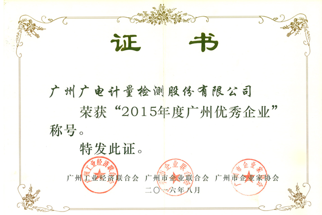 廣電計量獲授“2015年度廣州優(yōu)秀企業(yè)”稱號