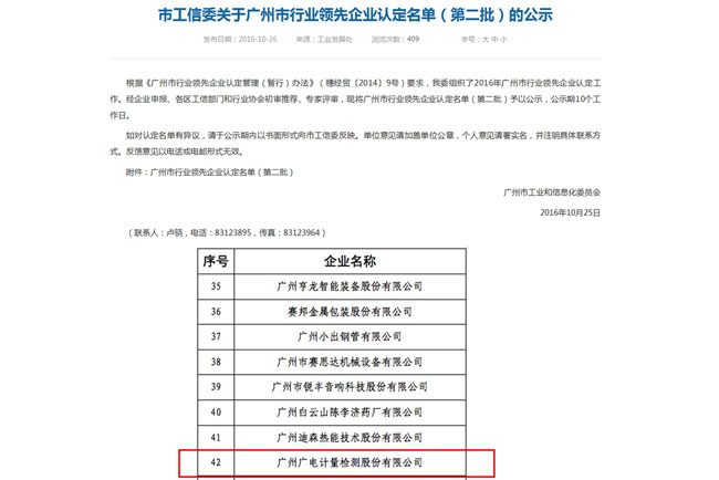 10月,根據《廣州市行業領先企業認定管理(暫行)辦法)》(穗經貿[2014]9號)要求,經廣州市工業和信息化委員會組織專家評審,廣電計量被認定為廣州市行業領先企業。
