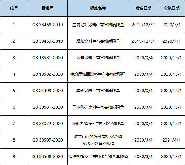 針對(duì)涂料、油墨、膠粘劑、清洗劑等四大類產(chǎn)品的相關(guān)VOCs含量限值標(biāo)準(zhǔn)均順利完成制定工作并發(fā)布。且已開(kāi)始實(shí)施,屬于國(guó)家強(qiáng)制標(biāo)準(zhǔn)