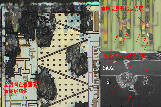 常見(jiàn)ESD物理失效表現(xiàn):襯底擊穿、多晶硅熔融、GOX pin hole、contact melted、metal melted等(見(jiàn)圖1),常見(jiàn)EOS物理失效表現(xiàn):氧化層、金屬層大面積熔融以及封裝體碳化等現(xiàn)象(見(jiàn)圖2)。
