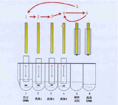 核酸提取儀(磁珠法)基本原理是:通過細(xì)胞裂解液裂解細(xì)胞,從細(xì)胞中游離出來的核酸分子被特異的吸附到磁性顆粒表面,而蛋白質(zhì)等雜質(zhì)不被吸附而留在溶液中。反應(yīng)一定時間之后,在磁場作用下,使磁性顆粒與液體分開,回收顆粒(即磁珠-DNA混合物),再用洗脫液洗脫即可以得到純凈的DNA。