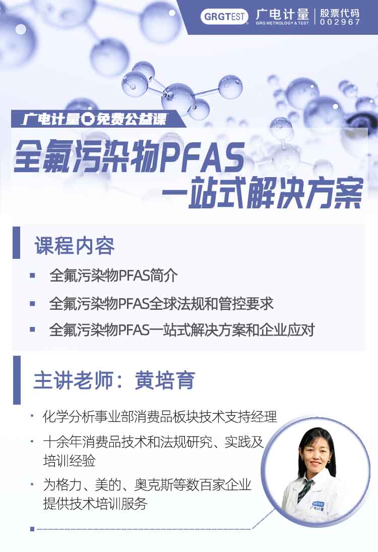 隨著各國PFAS管控要求增多,企業(yè)可能會面臨產(chǎn)品需要多次提交測試的困擾。廣電計量特開展《PFAS全氟污染物一站式解決方案》公開課,幫助企業(yè)全面解讀PFAS全球法規(guī)管控要求,協(xié)助企業(yè)盡早完成產(chǎn)品中全氟污染物的合規(guī)性檢測,規(guī)避出口產(chǎn)品違規(guī)風(fēng)險。