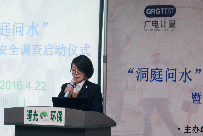 廣電計量副總經理、湖南子公司總經理李世華作為合作企業代表上臺發言,她指出,曙光環保發起的“洞庭問水”800里洞庭水安全調查,是一項非常有意義的社會公益活動,而這種社會公益活動也越來越需要社會各界有責任感的企業,團體及個人積極參與關注、支持,才能將公益活動引向深入,擴大影響。正因為如此,廣電計量在獲悉項目發起的第一時間,就積極響應,加入這一行動,為洞庭水質調查提供檢測支持,為水安全助力。