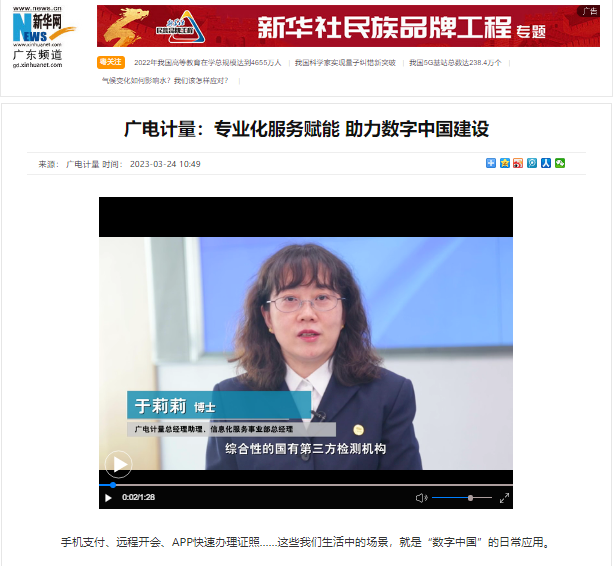 日前,廣電計(jì)量總經(jīng)理助理、信息化服務(wù)事業(yè)部總經(jīng)理于莉莉博士受邀接受新華網(wǎng)廣東頻道采訪,暢談數(shù)字經(jīng)濟(jì)新發(fā)展新機(jī)遇,并介紹公司在信息化檢驗(yàn)檢測(cè)領(lǐng)域的技術(shù)能力與標(biāo)準(zhǔn)建設(shè)參與情況,以“全、專、高”的技術(shù)服務(wù)助力數(shù)字中國(guó)建設(shè)。