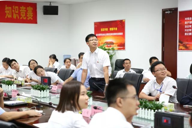 知識(shí)競(jìng)賽通過(guò)團(tuán)隊(duì)形式開(kāi)展,分別由職能綜合黨支部、市場(chǎng)綜合黨支部、計(jì)量綜合黨支部、計(jì)量長(zhǎng)力黨支部、計(jì)量電子黨支部、環(huán)境中心黨支部、檢測(cè)綜合黨支部和九頂山鋒方廣黨支部的骨干組成8支競(jìng)賽隊(duì)伍。競(jìng)賽設(shè)個(gè)人必答題、小組搶答題和小組風(fēng)險(xiǎn)題,題目類(lèi)型涵蓋單選、問(wèn)答及填空,均采取隨機(jī)抽題答題的方式進(jìn)行。內(nèi)容包含習(xí)近平新時(shí)代中國(guó)特色社會(huì)主義思想、黨的十九大報(bào)告、新黨章、習(xí)總書(shū)記對(duì)廣東工作重要指示批示精神和國(guó)有企業(yè)黨建工作會(huì)議精神等。