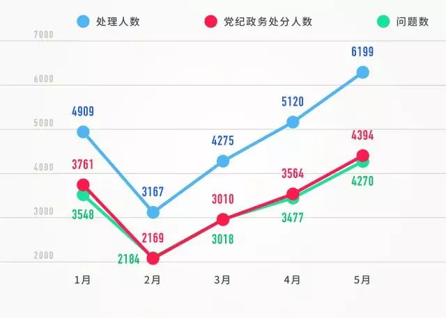 仔細梳理發現,今年1-5月,每月全國查處違反中央八項規定精神問題數、處理人數、給予黨紀政務處分人數相比去年同期均大幅上升。此外,除2月有下降外,1-5月的各項數據呈逐月攀升趨勢。