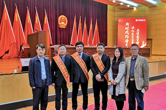 嚴(yán)宇兵(左三)獲得武漢市洪山區(qū)“優(yōu)秀勞動(dòng)者”榮譽(yù)稱號(hào)