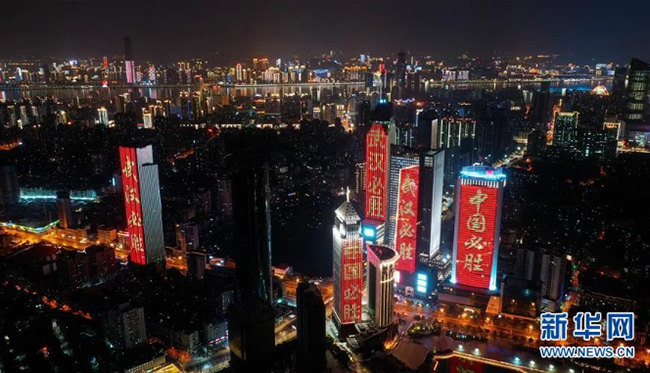 這是3月15日晚拍攝的武漢市江漢區(qū)西北湖附近高層建筑外墻打出“武漢必勝”“中國(guó)必勝”字樣(無(wú)人機(jī)照片)。夜幕降臨,湖北武漢不少建筑點(diǎn)亮了景觀燈,為武漢加油。新華社記者 陳曄華 攝