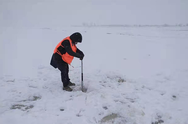 由于遇上風(fēng)雪天氣,能見(jiàn)度極低,加上路上積雪太深,車輛無(wú)法靠近采樣點(diǎn)位,他們絲毫沒(méi)有退縮的想法,毅然選擇下車徒步前進(jìn)。好不容易走過(guò)3公里鋪滿積雪的田野小路,來(lái)到預(yù)定的監(jiān)測(cè)采樣點(diǎn)位,他們手腳都凍僵了,但也顧不上捂一捂、跺一跺,馬上拿出工具,采樣、裝瓶、記錄數(shù)據(jù),4個(gè)小時(shí)下來(lái)整個(gè)采樣和監(jiān)測(cè)流程有條不紊。采樣完成后,又原路返回車上,繼續(xù)奔赴下一個(gè)斷面采樣點(diǎn)。