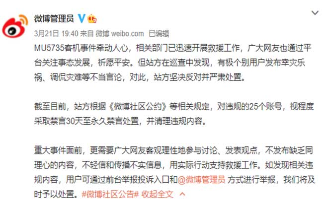 微博處置25個(gè)調(diào)侃墜機(jī)災(zāi)難賬號(hào)