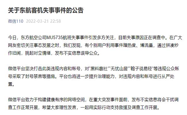 “微信110”公眾號(hào)21日發(fā)布公告:有個(gè)別用戶利用事件蹭熱度、博流量,通過拼湊炒作舊聞,挑起對(duì)立情緒,發(fā)布不實(shí)信息誤導(dǎo)公眾。微信平臺(tái)堅(jiān)決打擊此類違規(guī)內(nèi)容和帳號(hào),對(duì)“黑料趣社”“無憂山居”“翰子說易經(jīng)”等違規(guī)公眾帳號(hào)采取了封號(hào)禁言等措施。平臺(tái)也將進(jìn)一步提升治理能力,對(duì)違規(guī)內(nèi)容和帳號(hào)進(jìn)行從嚴(yán)處置。
