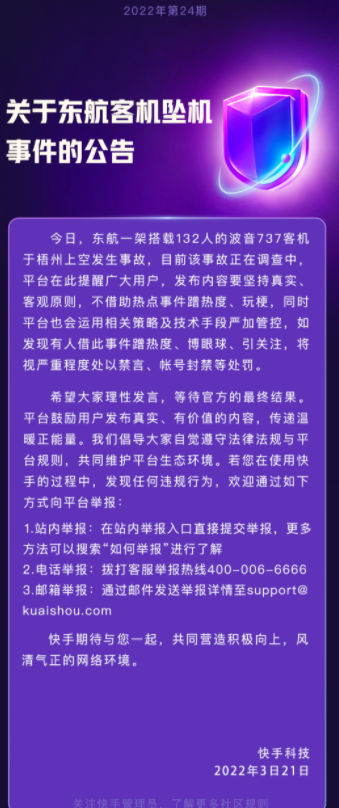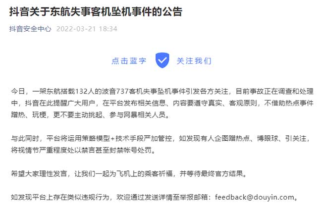 ”抖音安全中心“微信公眾號(hào)21日發(fā)布公告:一架東航搭載132人的波音737客機(jī)失事墜機(jī)事件引發(fā)各方關(guān)注,目前事故正在調(diào)查和處理中,抖音在此提醒廣大用戶,在平臺(tái)發(fā)布相關(guān)信息、內(nèi)容要遵守真實(shí)、客觀原則,不借助熱點(diǎn)事件蹭熱、玩梗,更不要主動(dòng)挑起、參與網(wǎng)暴相關(guān)人員。與此同時(shí),平臺(tái)將運(yùn)用策略模型+技術(shù)手段嚴(yán)加管控,如發(fā)現(xiàn)有人企圖蹭熱點(diǎn)、博眼球、引關(guān)注,將視情節(jié)嚴(yán)重程度處以禁言甚至封禁帳號(hào)處罰。
