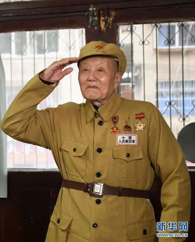 張富清穿著老式軍裝敬軍禮(2019年3月31日攝)。新華社記者 程敏 攝